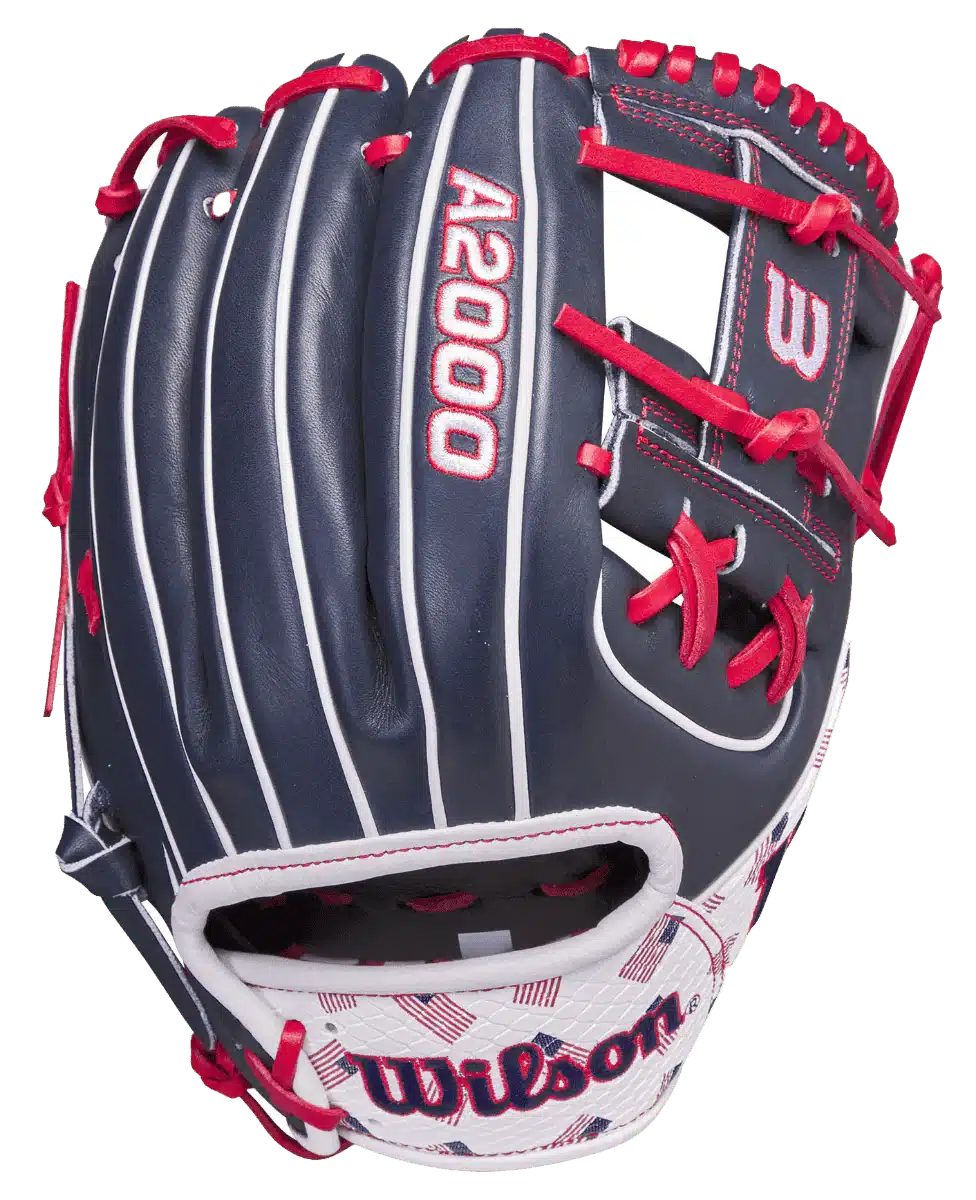 Speckled by Stars & Stripes, the July GOTM features Navy Blue Pro Stock leather and White SuperSnakeSkin with USA flag prints scattered on the thumb, wrist, and pinky. This 1786 is designed with a shallow pocket and H-Web for easy transfers on the infield.