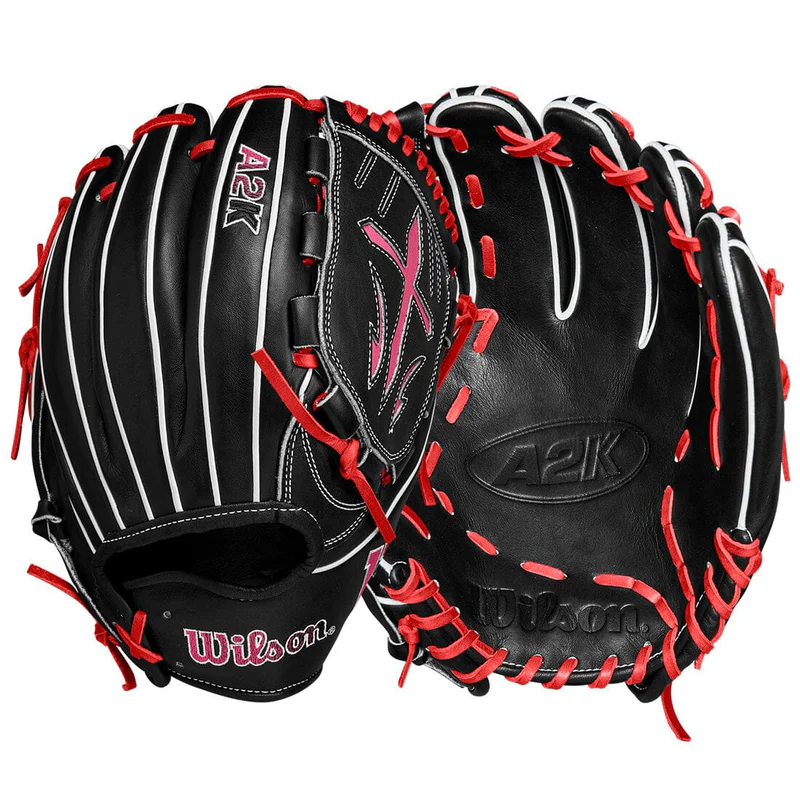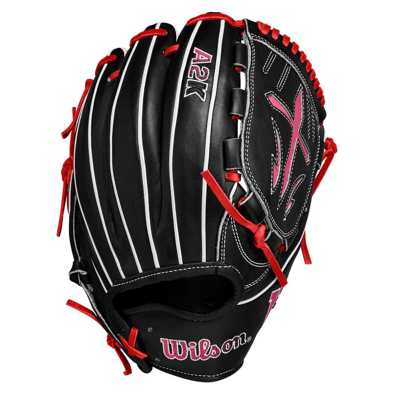 This new Wilson A2K offers a 12” pitcher’s glove model with a modified wrist strap and wider pinky stall for improved fit. Offering a Black, Pink, and White Stitching colorway.
