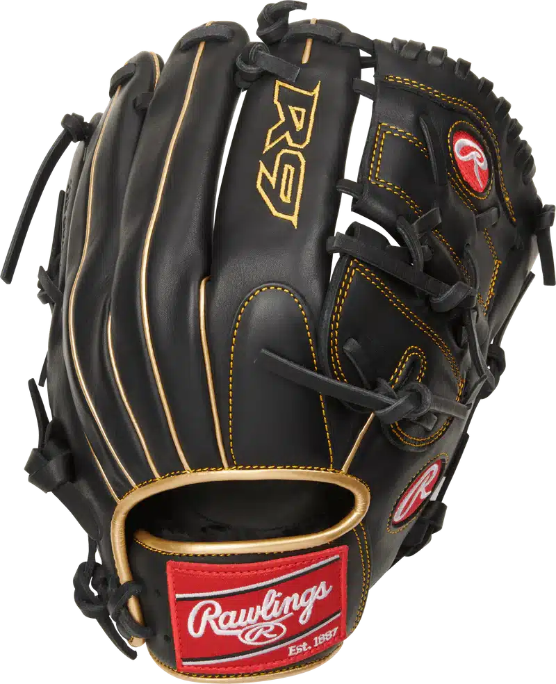 In addition, Rawlings R9 gloves all feature padded finger-back lining and thumb loops, along with reinforced palm padding too. Together, these combine to give athletes superior comfort and feel every time they put it on. This glove was also crafted in their popular, pro-200-pattern with a 2-piece solid web, making it ideal for both infielders and pitchers alike. The gold binding and welting accent the black leather perfectly, for an eye-catching design that is sure to turn heads.