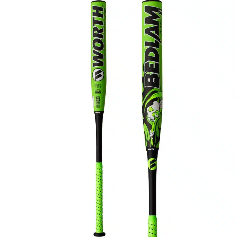 In addition, this Bedlam USSSA slowpitch bat combines a short 12.5″ barrel with a .5oz XL end load to pack a punch at impact. It also features Worth’s S-Flex handle which offers a stiffer feel ideal for players with faster swing speeds. The stiff handle allows the barrel to stay in the zone longer for insane exit speeds. All this topped off by an eye-catching bright green Bedlam design, you’ll stand out every time you step up to the plate. This model is perfect for those with great barrel control looking for some extra pop of a shorter barrel.
