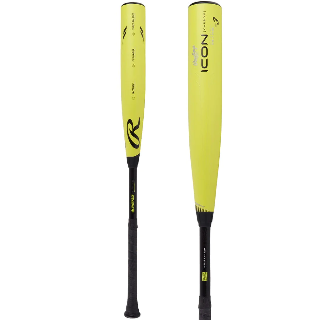 The Rawlings ICON Glowstick is a Limited Edition of their most popular ICON BBCOR Baseball Bat. This bat offers a 2 5/8 inch barrel diameter, balanced swing weighting, -3 length to weight ratio, and is legal for play in all BBCOR Sanctioned Leagues and Tournaments.